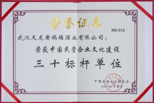 在中國民營企業(yè)文化建設(shè)總結(jié)表彰儀式上,武漢天龍黃鶴樓酒業(yè)有限公司榮獲“中國民營企業(yè)文化建設(shè)三十標(biāo)桿單位”稱號(hào),公司董事長許鵬榮獲“中國民營企業(yè)文化建設(shè)先進(jìn)個(gè)人”稱號(hào)。