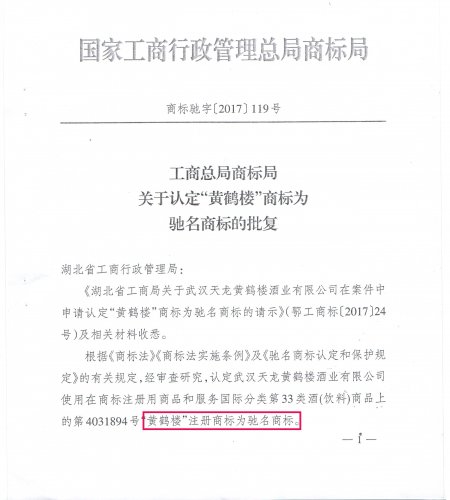 日前,公司收到國家工商行政管理總局商標局下發(fā)文件《商標馳字【2017】119號工商總局商標局關(guān)于認定“黃鶴樓”商標為馳名商標的批復(fù)》,文件中正式認定“黃鶴樓”商標為中國馳名商標。